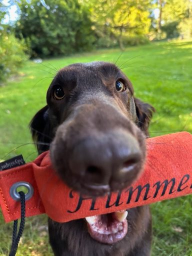 Hummel ist eine braune Hündin von mittlerer Größe und stabilem, muskulösem und ästhetischem Körperbau. Sie hat bernsteinfarbene Augen und ein glänzendes Fell. Sie ist sanft im Umgang, apportiert für ihr Leben gern und ist im häuslichen Umfeld sehr wachsam. Dabei ist sie stets freundlich und hat eine sehr starke Bindung zu ihren Rudelführern. Sie hat vorzügliche Gesundheitsdaten, den Wesenstest mit Bravour bestanden und den Formwert mit vorzüglich abgeschlossen.