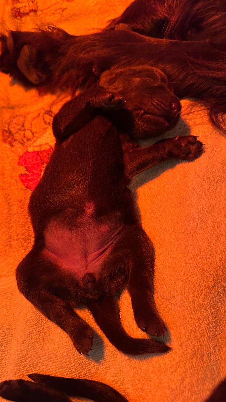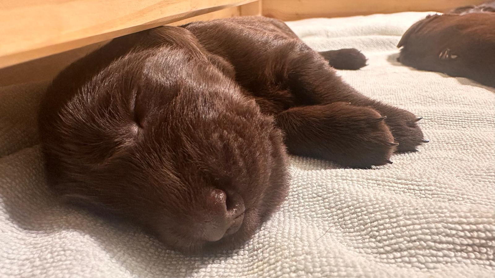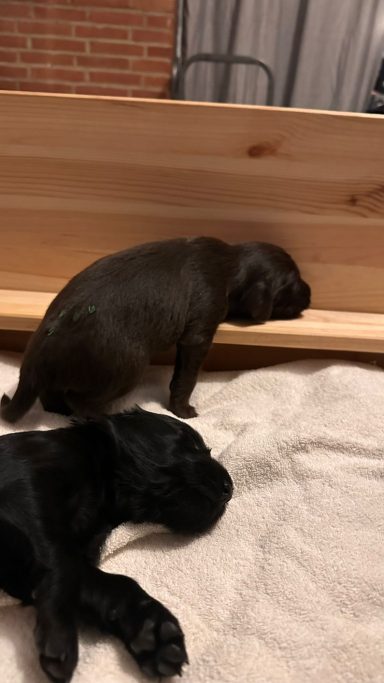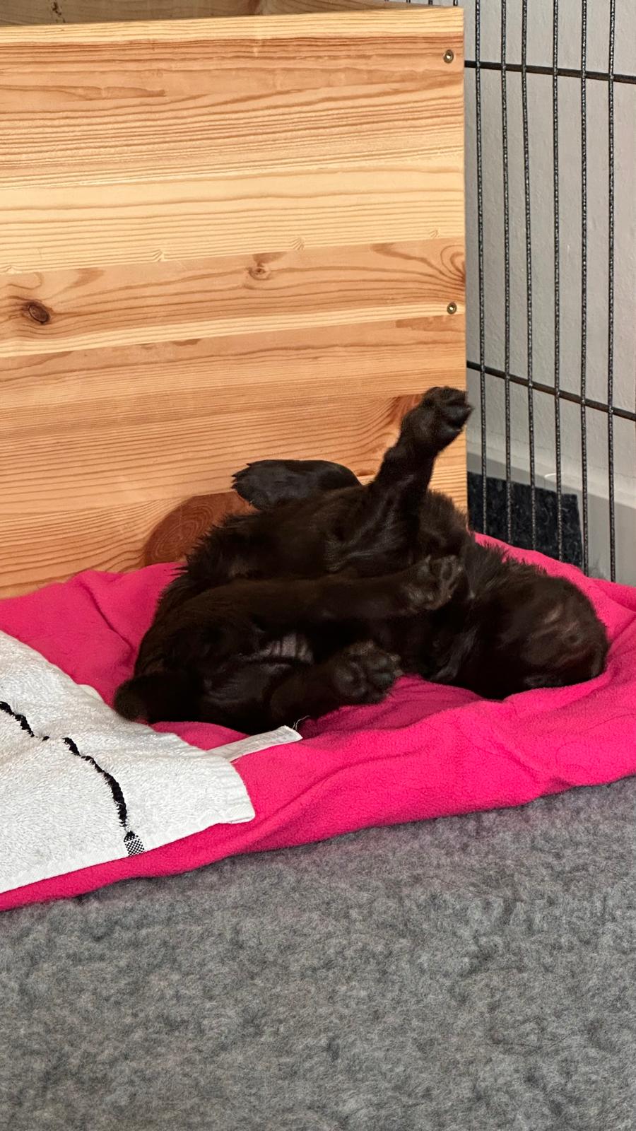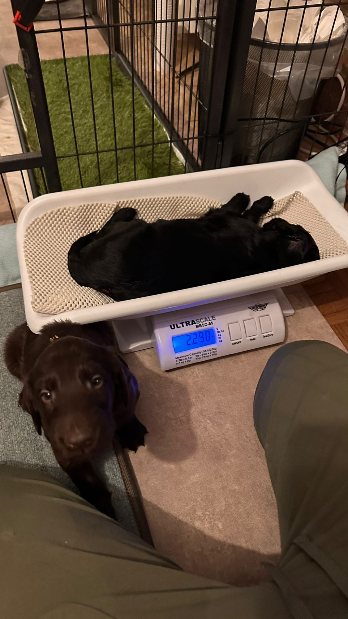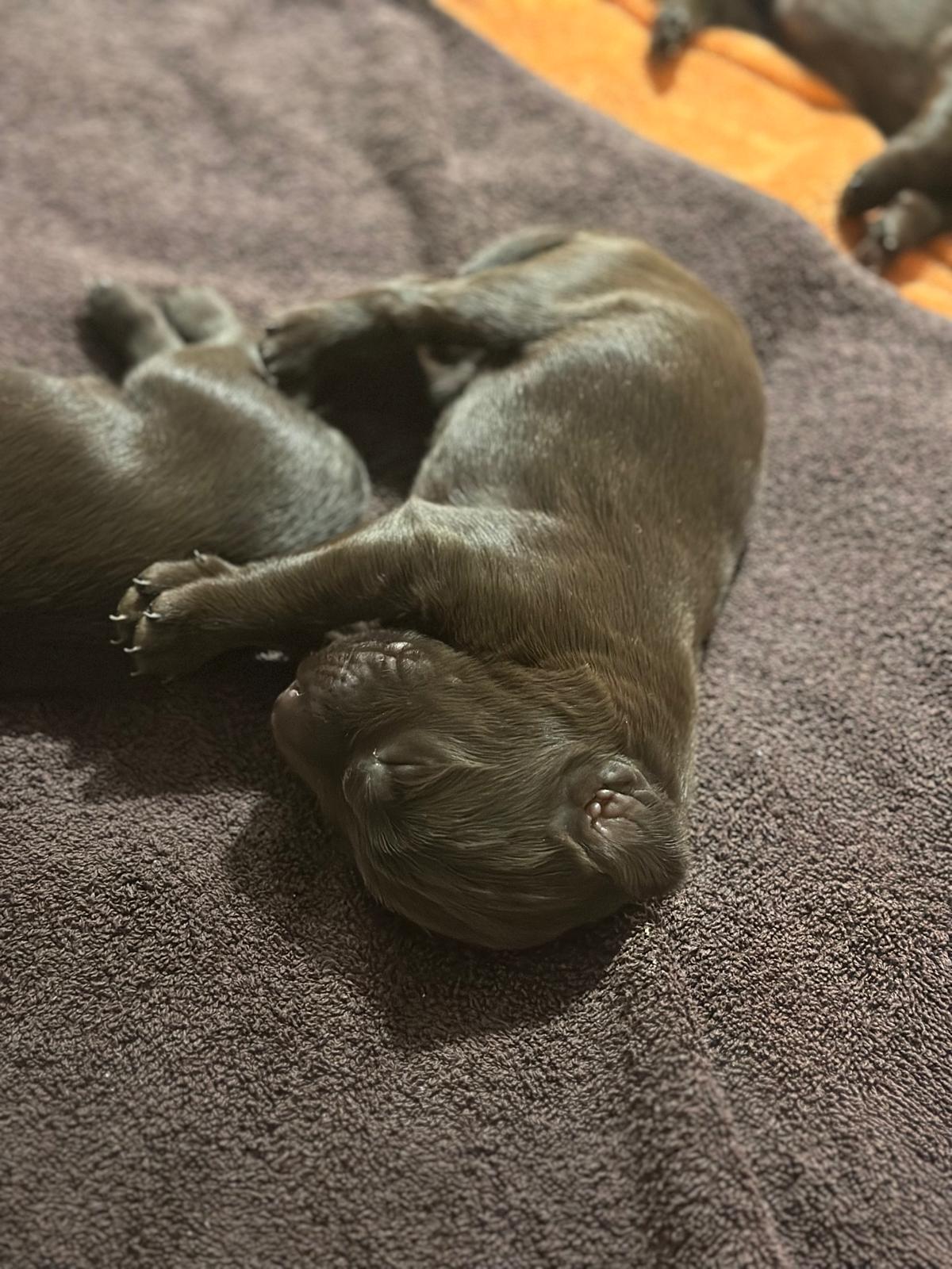 Während die Maus Schwarz rot beim Wiegen einfach weiterschläft, büxt der kleine braune Rüde aus und schaut frech in die Kamera :)