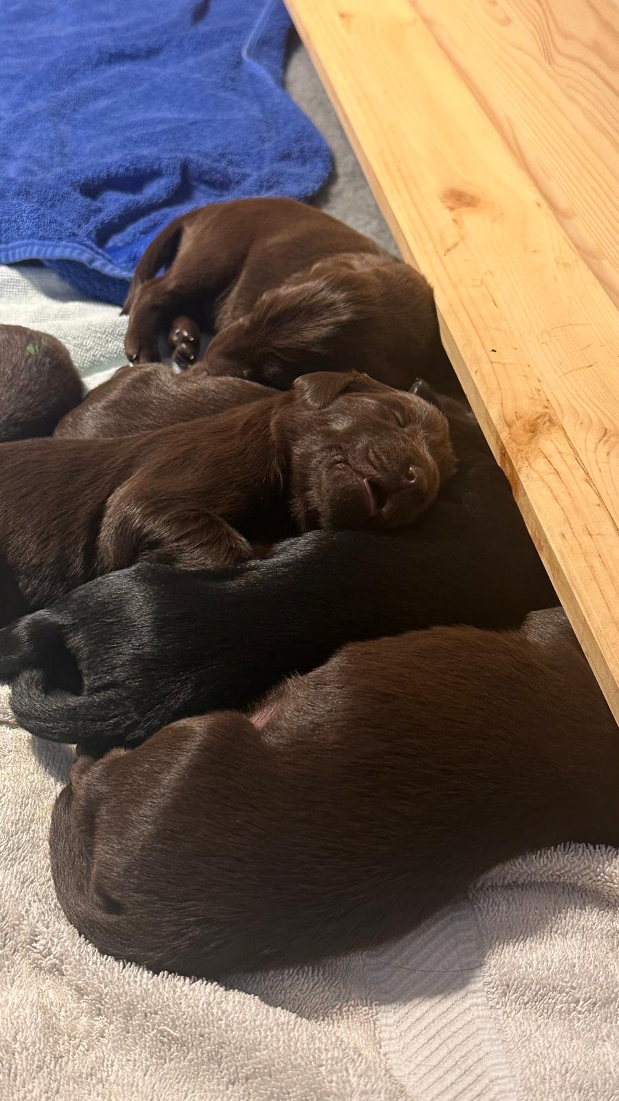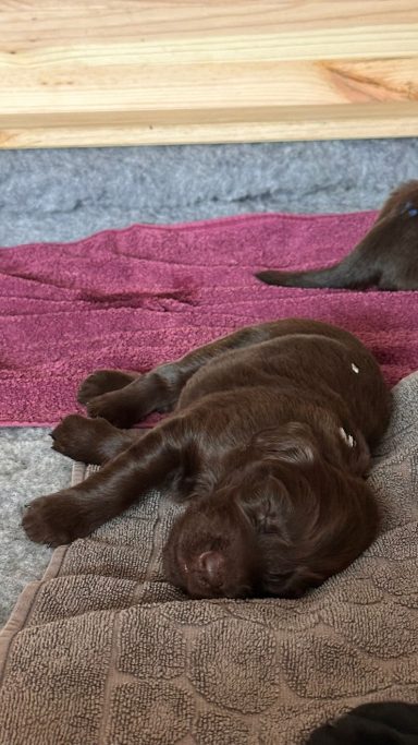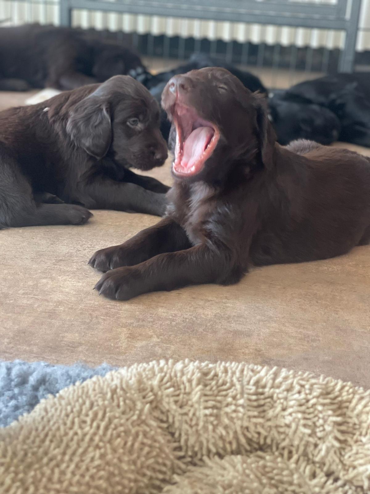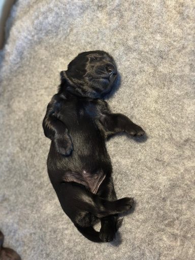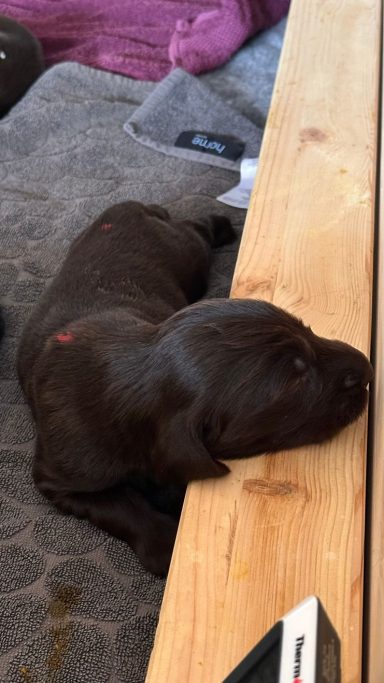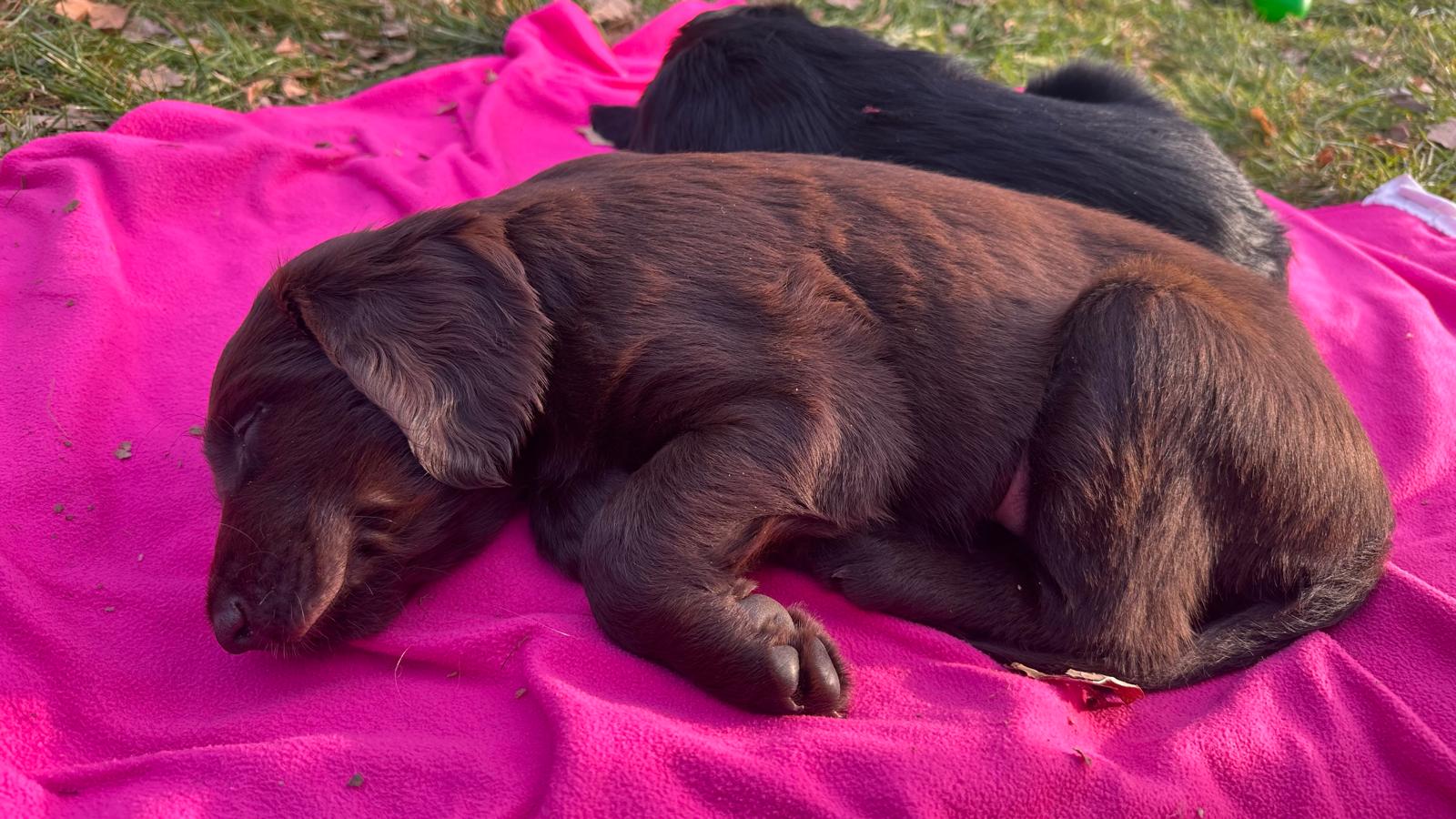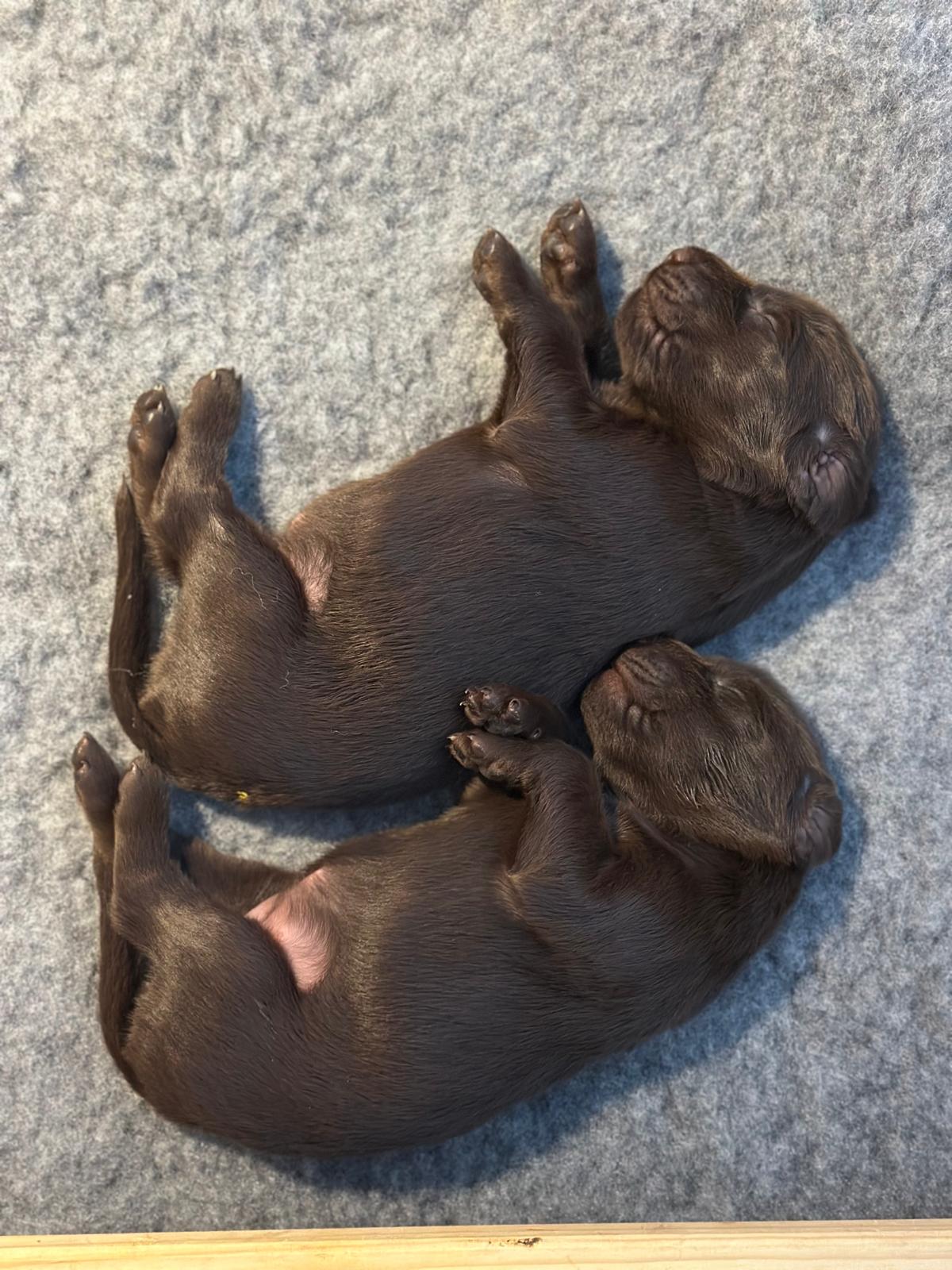 Während die Maus Schwarz rot beim Wiegen einfach weiterschläft, büxt der kleine braune Rüde aus und schaut frech in die Kamera :)