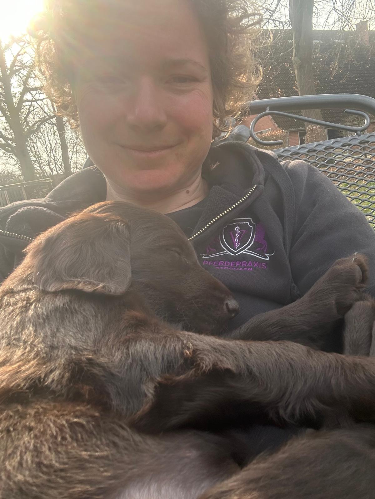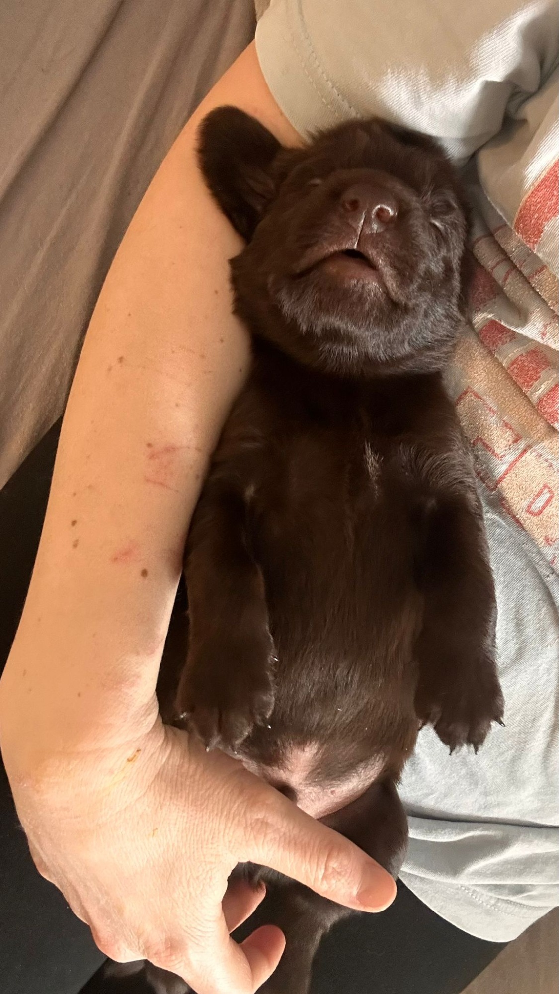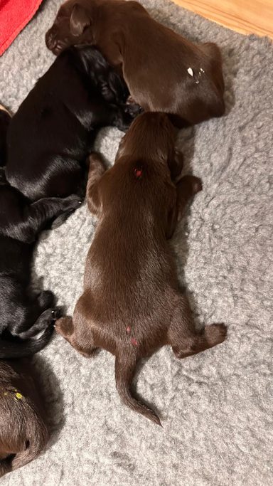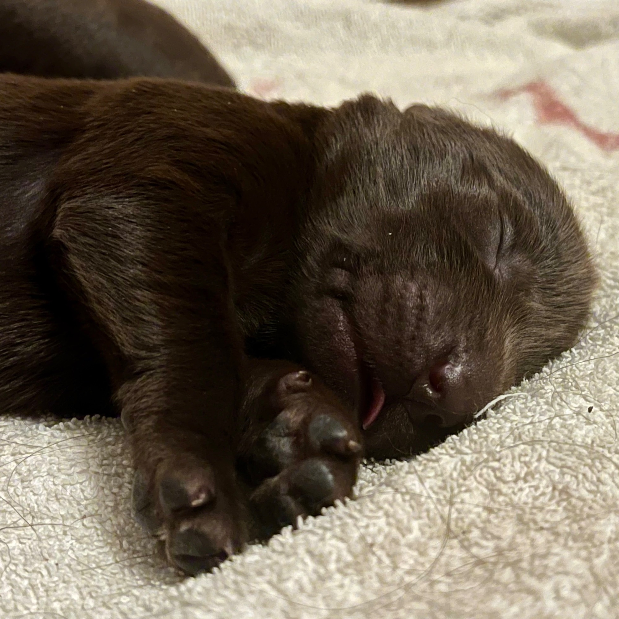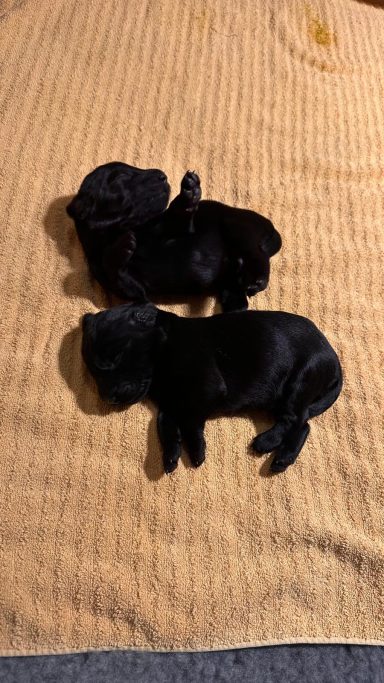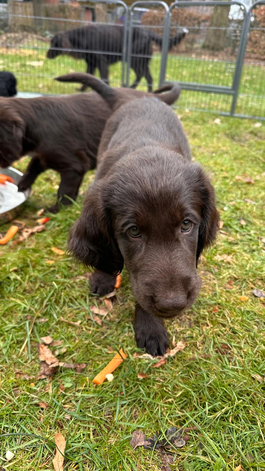 Während die Maus Schwarz rot beim Wiegen einfach weiterschläft, büxt der kleine braune Rüde aus und schaut frech in die Kamera :)