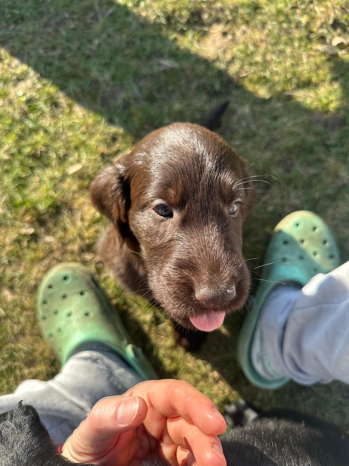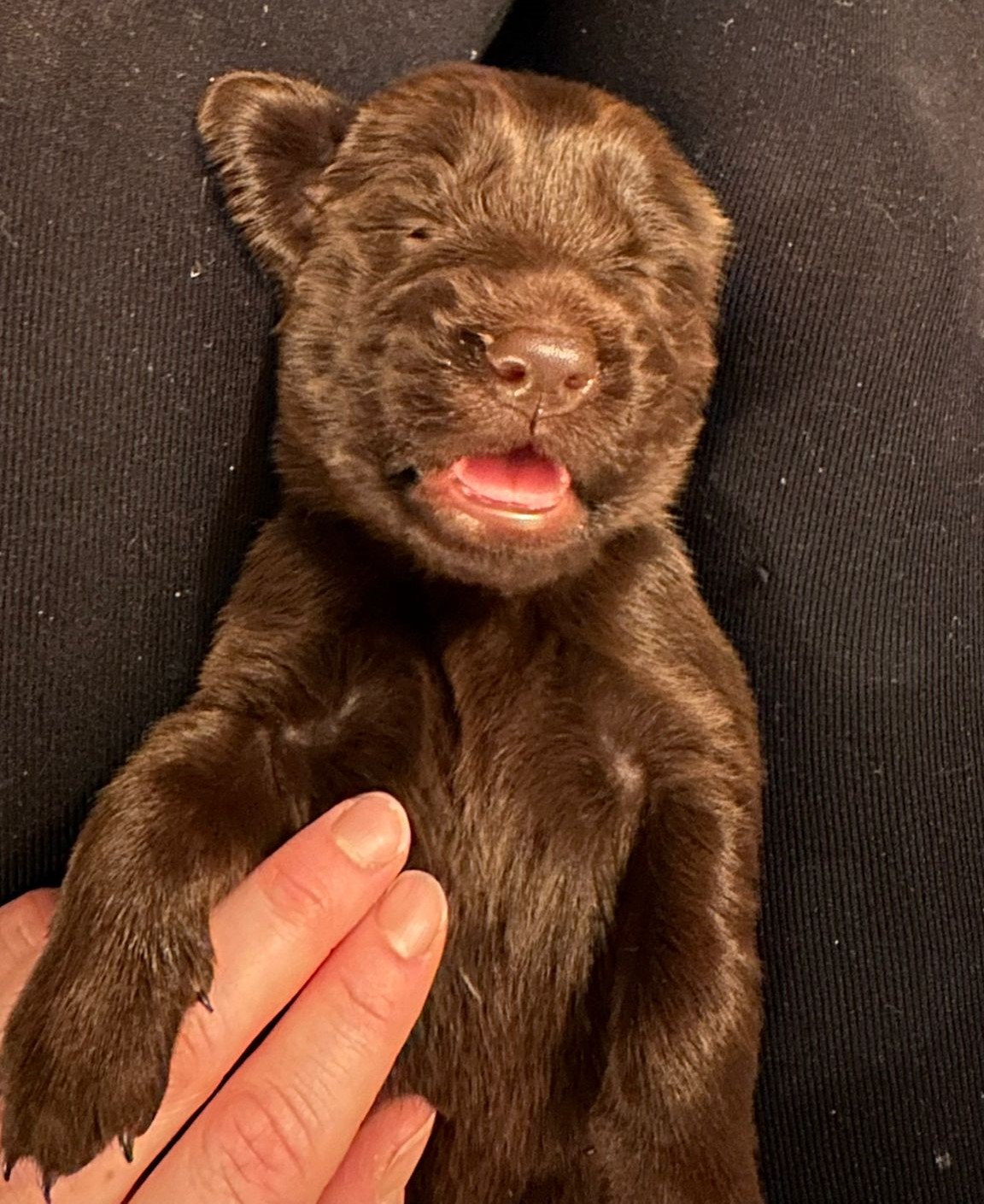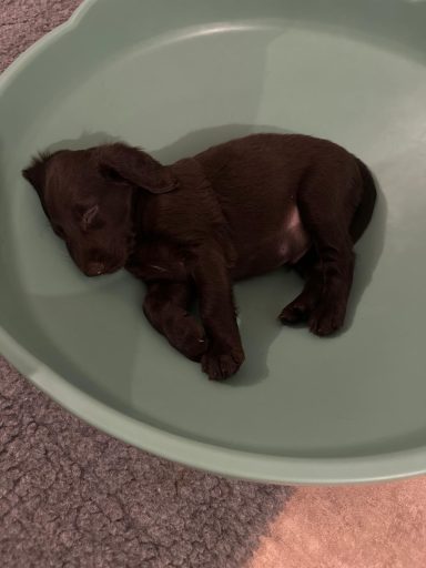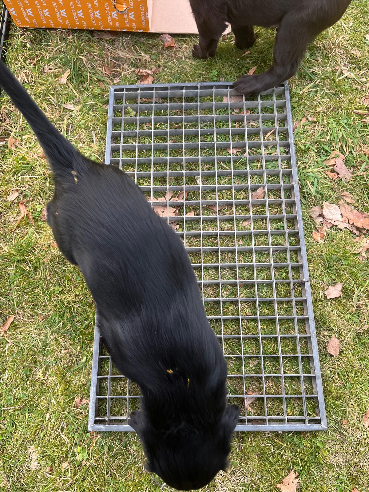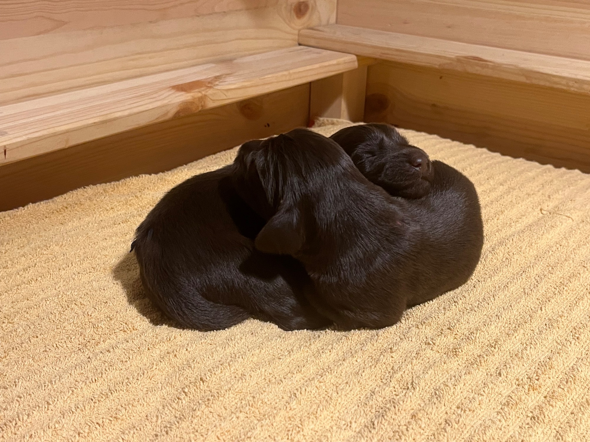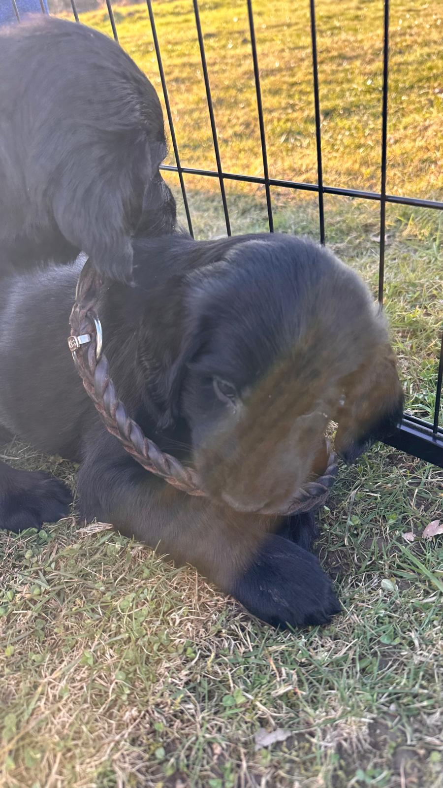 Während die Maus Schwarz rot beim Wiegen einfach weiterschläft, büxt der kleine braune Rüde aus und schaut frech in die Kamera :)