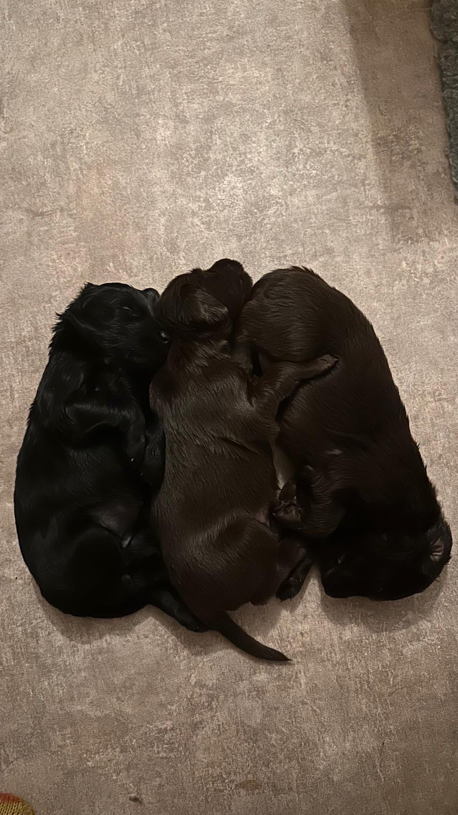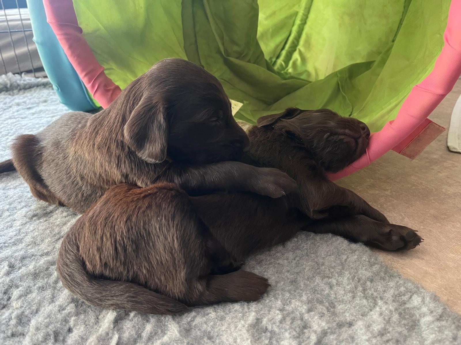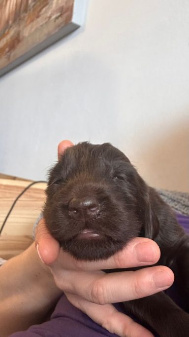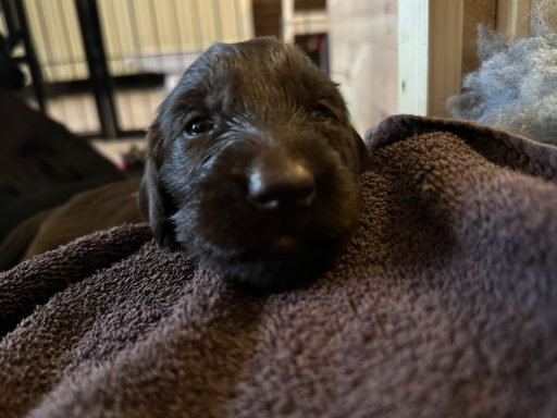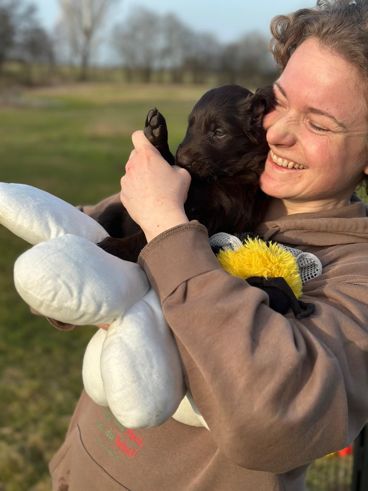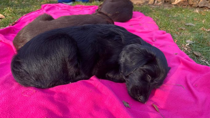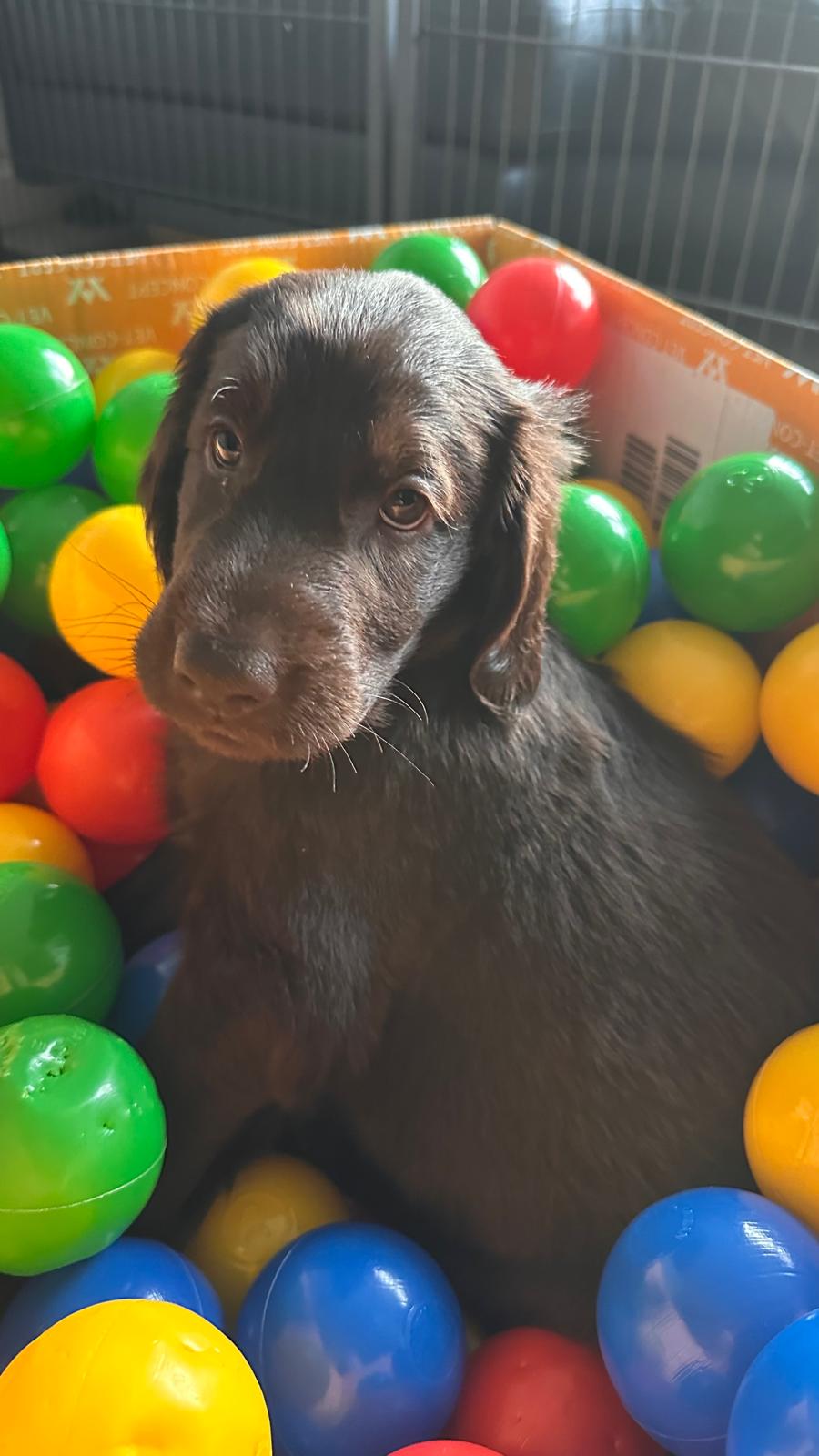 Während die Maus Schwarz rot beim Wiegen einfach weiterschläft, büxt der kleine braune Rüde aus und schaut frech in die Kamera :)