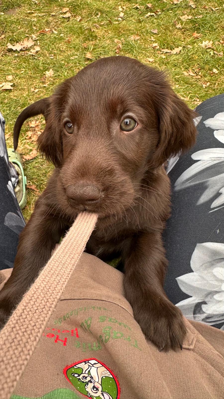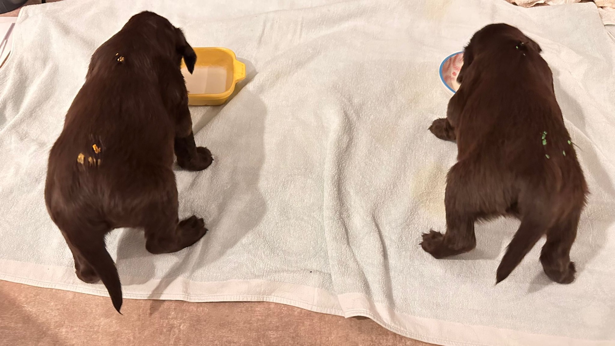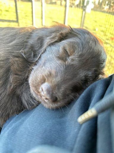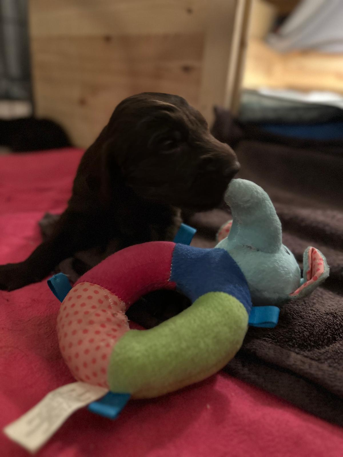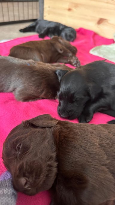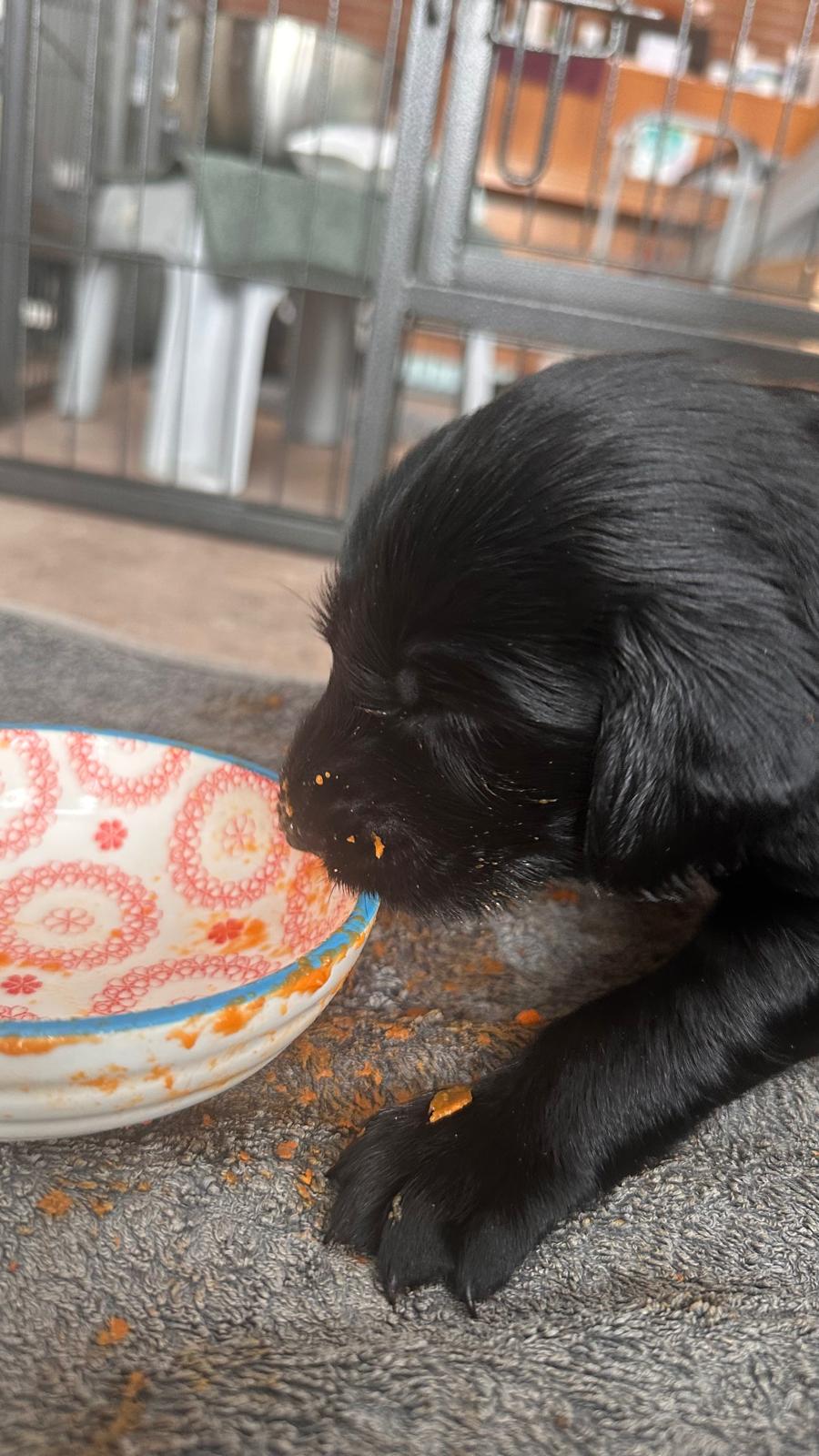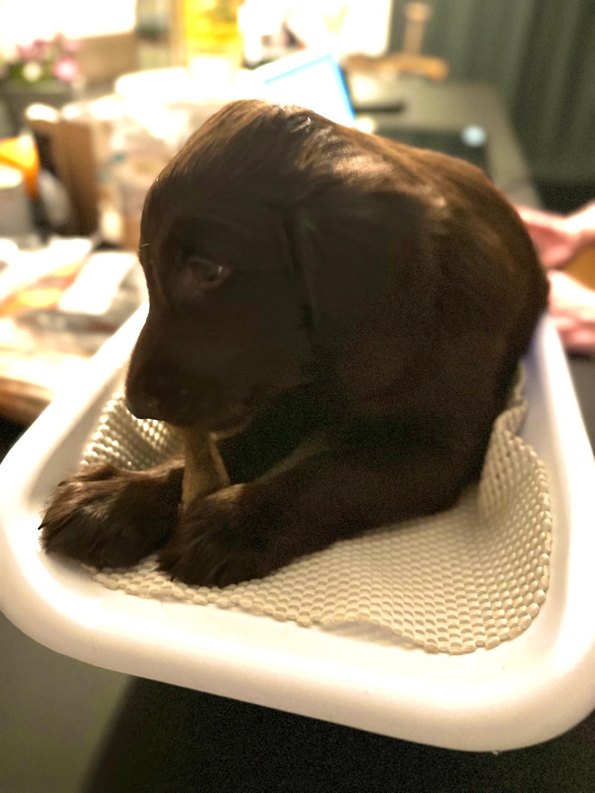 Während die Maus Schwarz rot beim Wiegen einfach weiterschläft, büxt der kleine braune Rüde aus und schaut frech in die Kamera :)