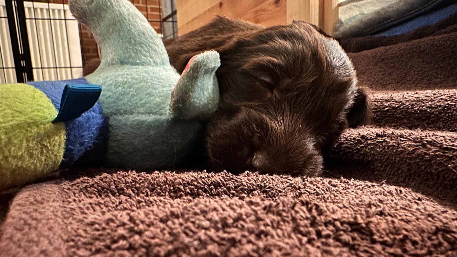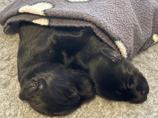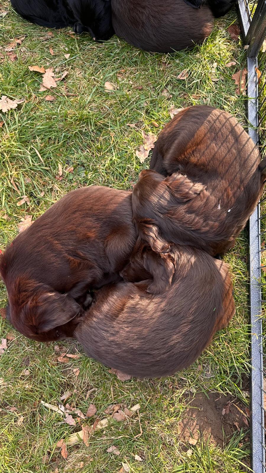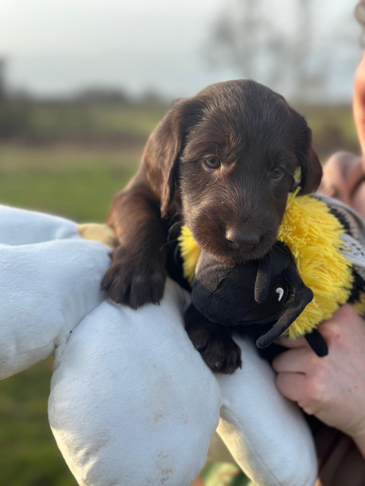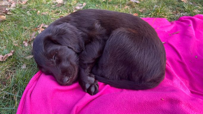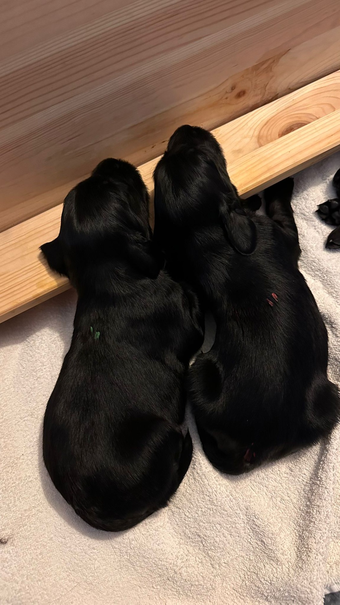 Während die Maus Schwarz rot beim Wiegen einfach weiterschläft, büxt der kleine braune Rüde aus und schaut frech in die Kamera :)