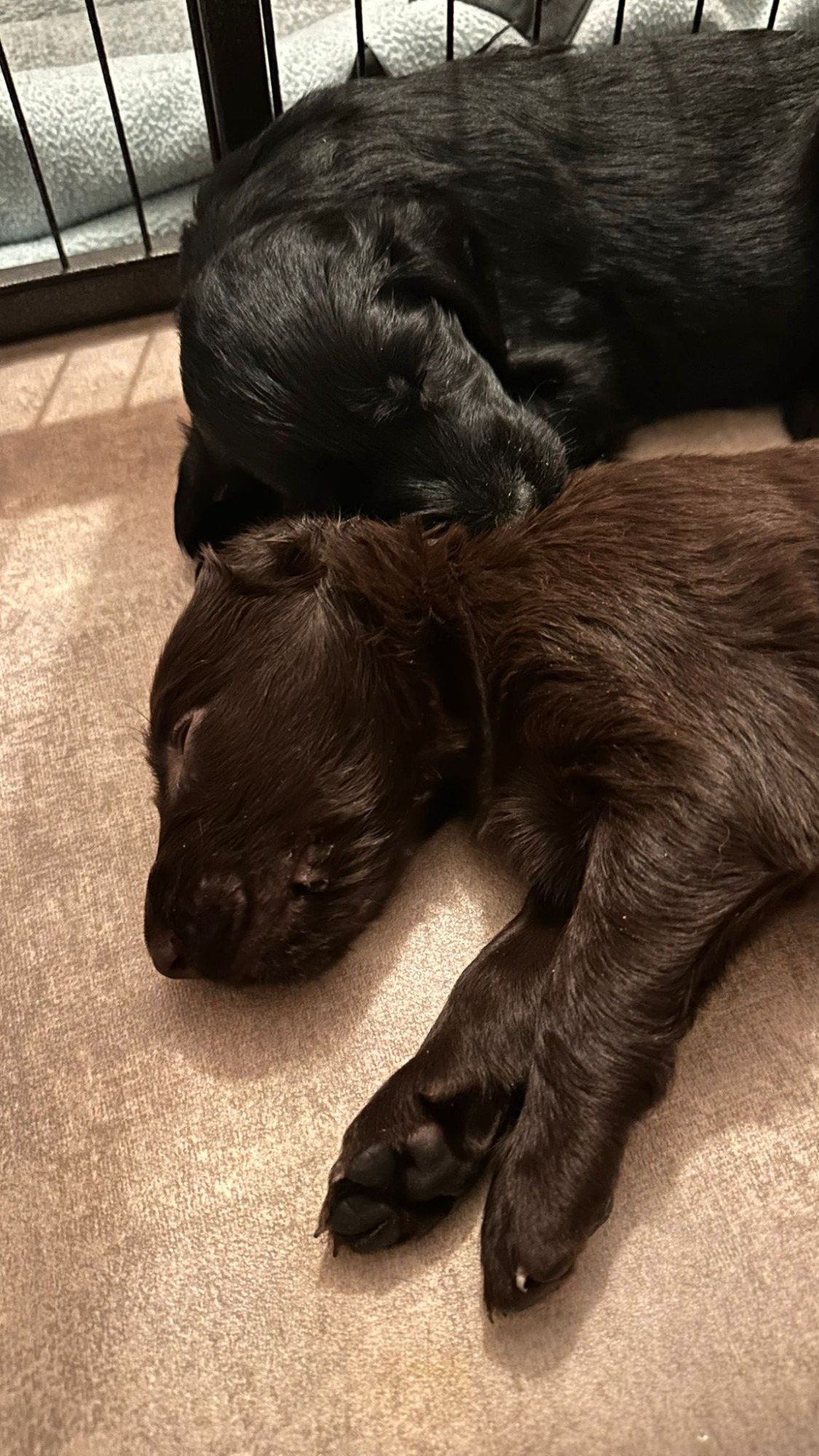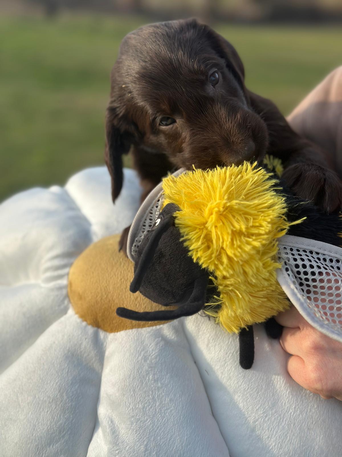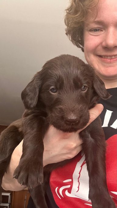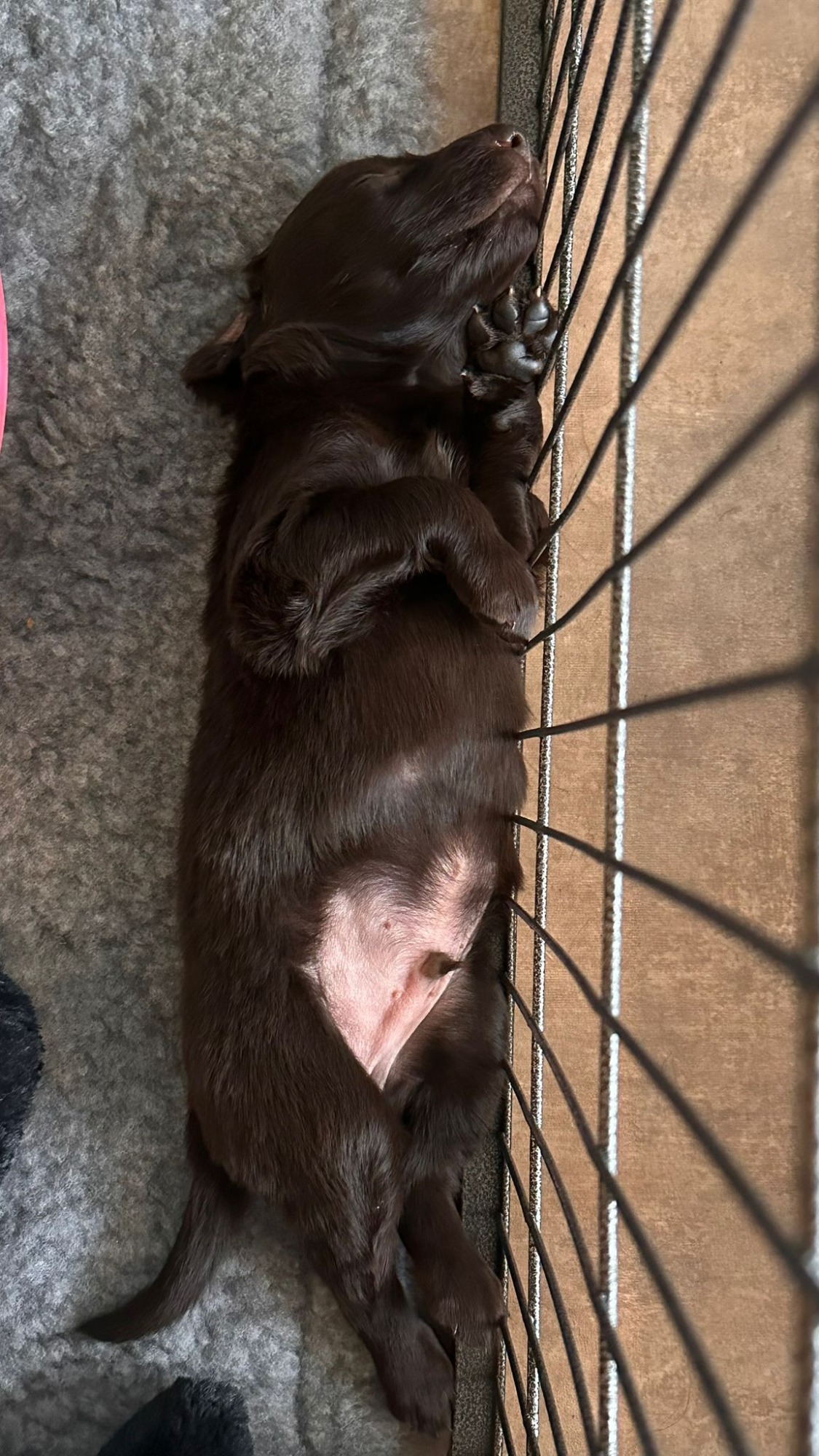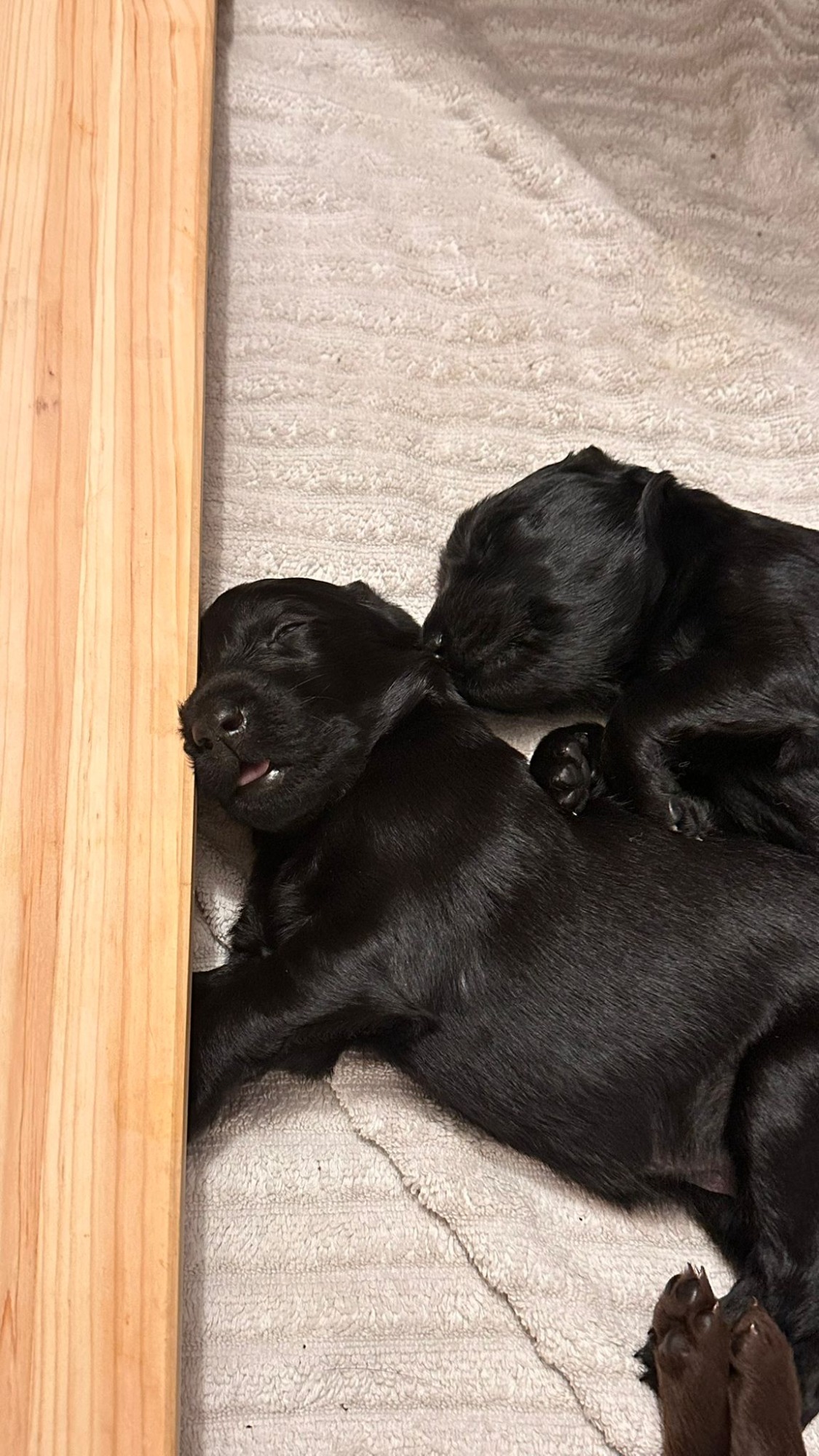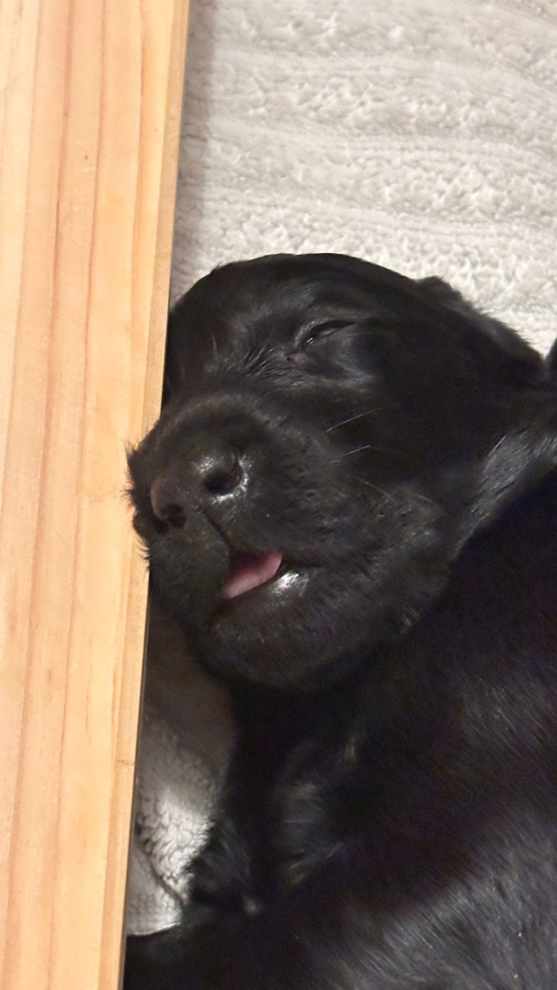 Während die Maus Schwarz rot beim Wiegen einfach weiterschläft, büxt der kleine braune Rüde aus und schaut frech in die Kamera :)